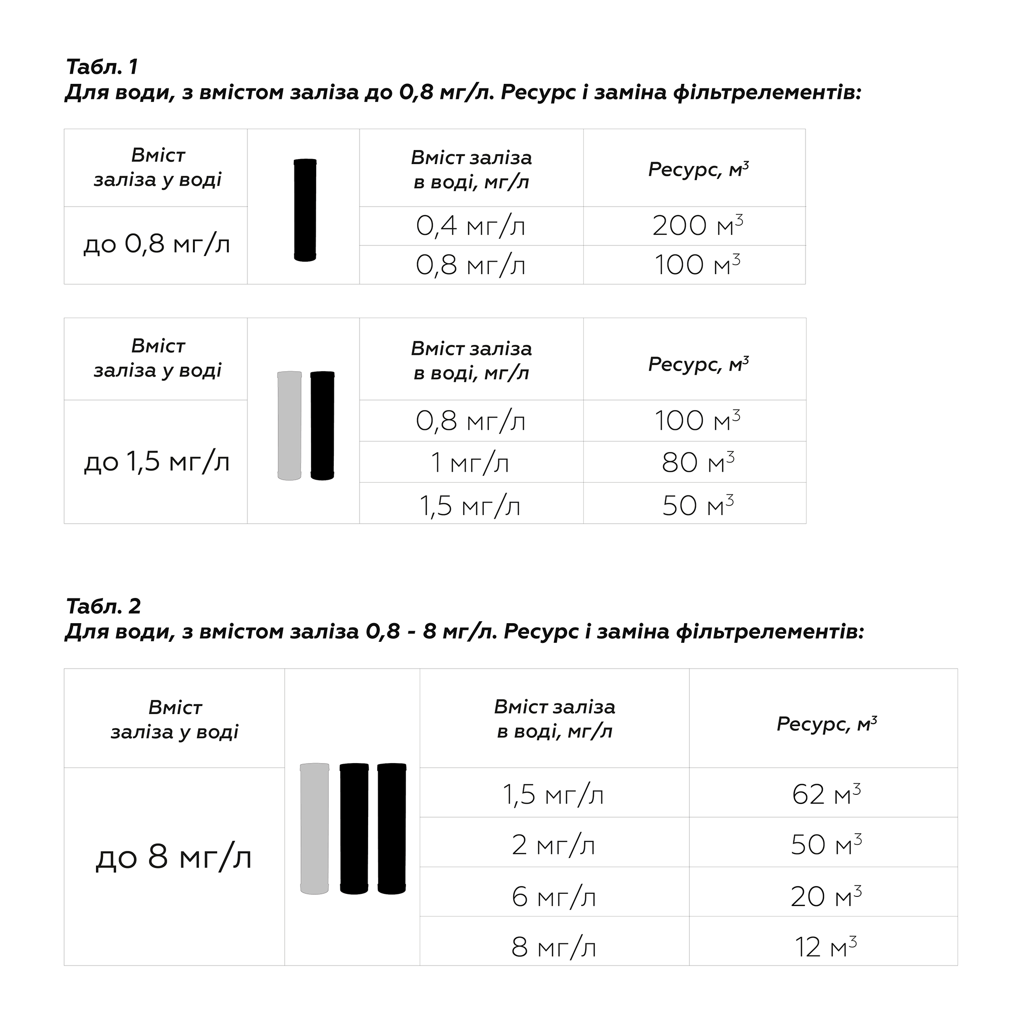 Deferrization Module: removes water insoluble (ferric) iron, also transfers the soluble (ferrous) ones to insoluble form and filters it. Thus, a decrease of iron content in the water up to standard indicators (0.2-0.3 mg/l) occurs and manganese is removed.