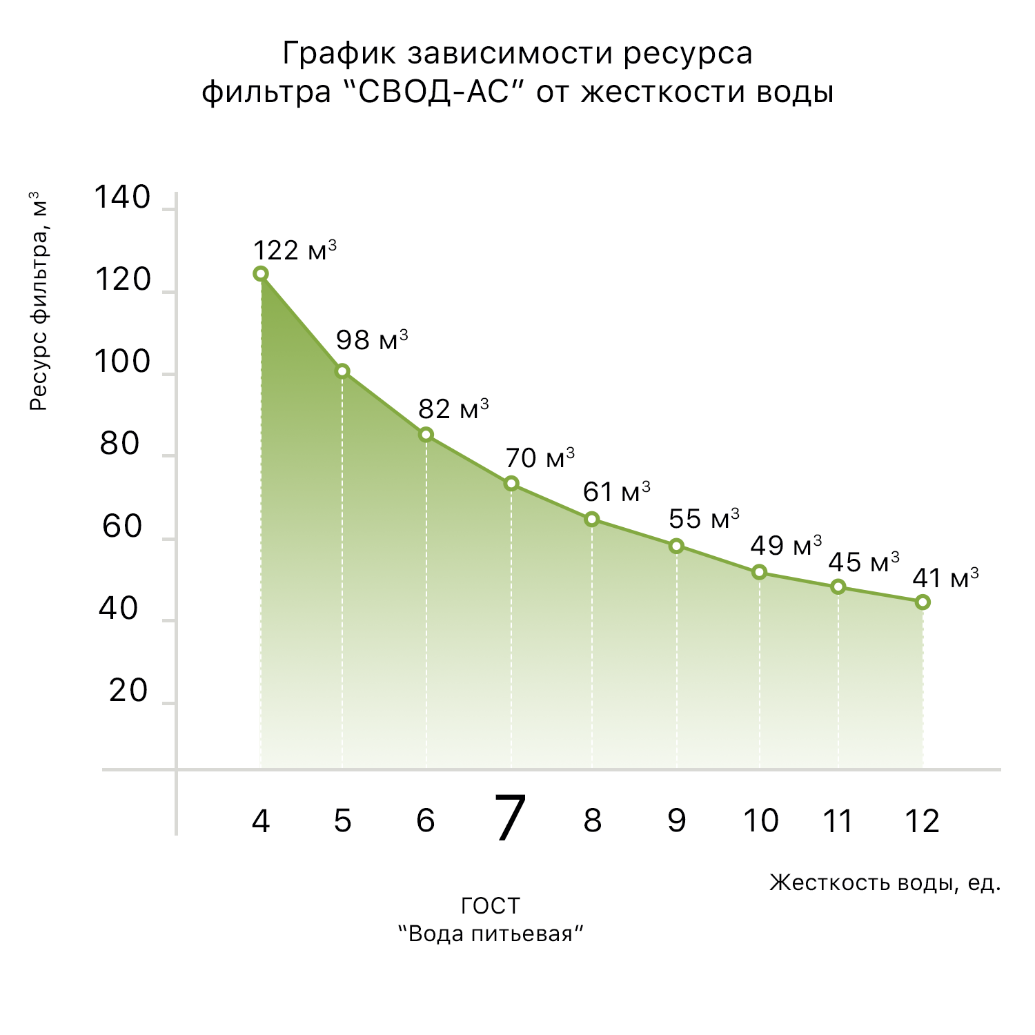 Ресурс - 70 000 л (при условии что вода соответствует ГОСТу 7525:2014 "Вода питьевая")